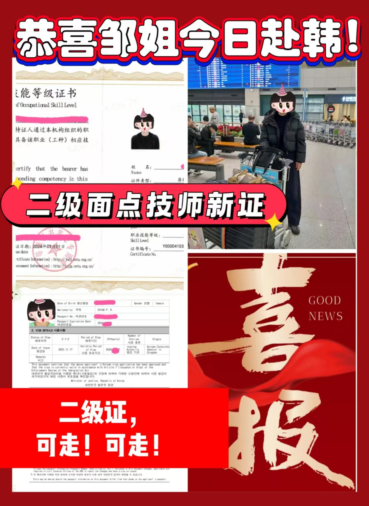 近日,公司再傳捷報(bào):來(lái)自沈陽(yáng)的面點(diǎn)師鄒女士憑借二級(jí)技師證,僅用短短數(shù)天便成功獲批韓國(guó) E-7-2 工作簽證,即將入職大田甜蜜北京(化名),月薪達(dá) 260 萬(wàn)韓元(約合人民幣 1.25 萬(wàn)元),開(kāi)啟三年海外職業(yè)征程。